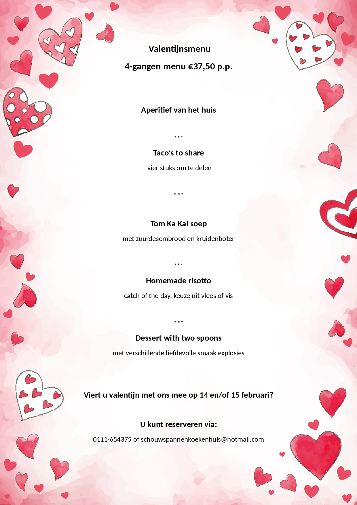 U kunt reserveren via 0111-654375 of schouwspannenkoekenhuis@hotmail.com