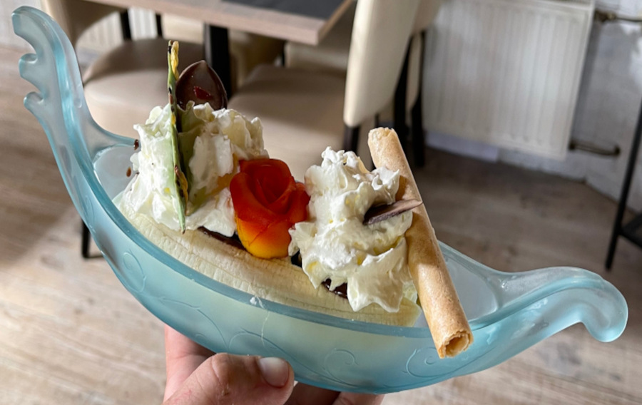€ 8,75Vanille ijs, banaan met warme chocoladesaus en slagroom